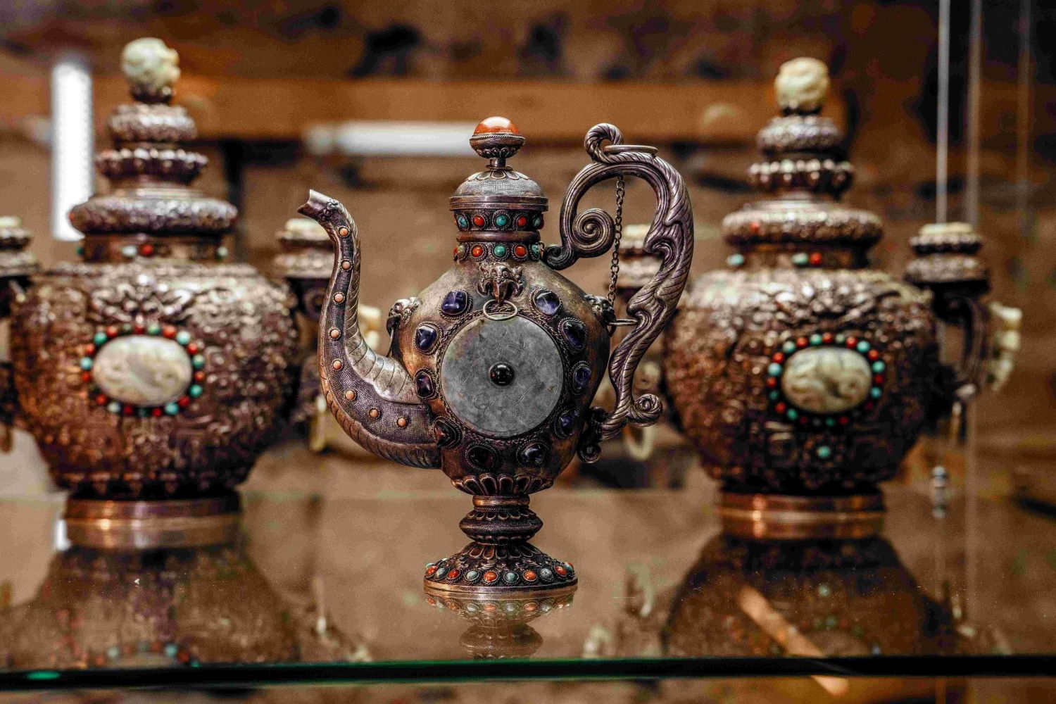 Exponáty odrážejí mistrovství tradičních čínských řemesel a hlubokou symboliku dvorských ceremonií dynastie Čching. Patří sem bohatě inkrustované kumgany, rituální meče, svícny, stúpy či předměty každodenního dvorského života. Každý kus nese příběh o prestiži, tradici a schopnosti přizpůsobit se novým dobám.