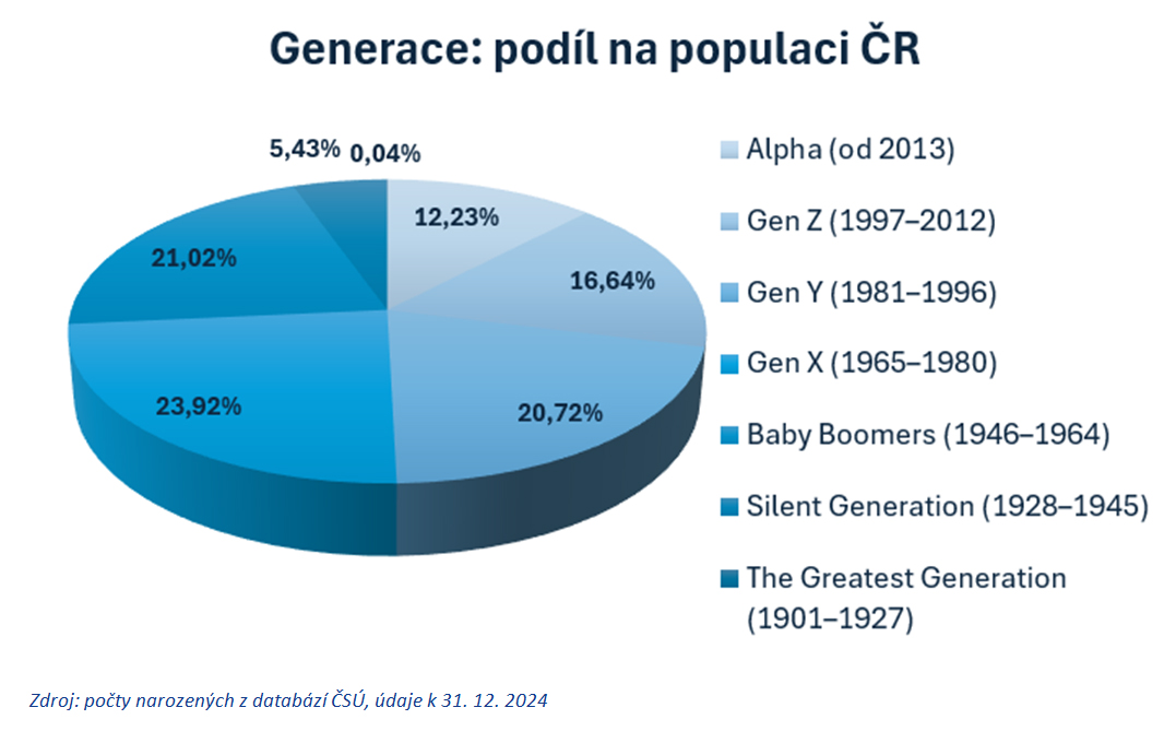 Nejsilnější je nyní generace X, tedy lidé ve věku 45 až 60 let, kterých je v české populaci 2,6 milionu, tedy 23,92 procenta, dvě okolní generace – tedy takzvaní boomeři a mileniálové – mají podobně těsně pod 2,3 milionu členů, tedy zhruba 21 procent. Počet lidí v generaci Z je více 1,7 milionu, tedy 16,6 procenta z celkových 10,9 milionu obyvatel ČR.