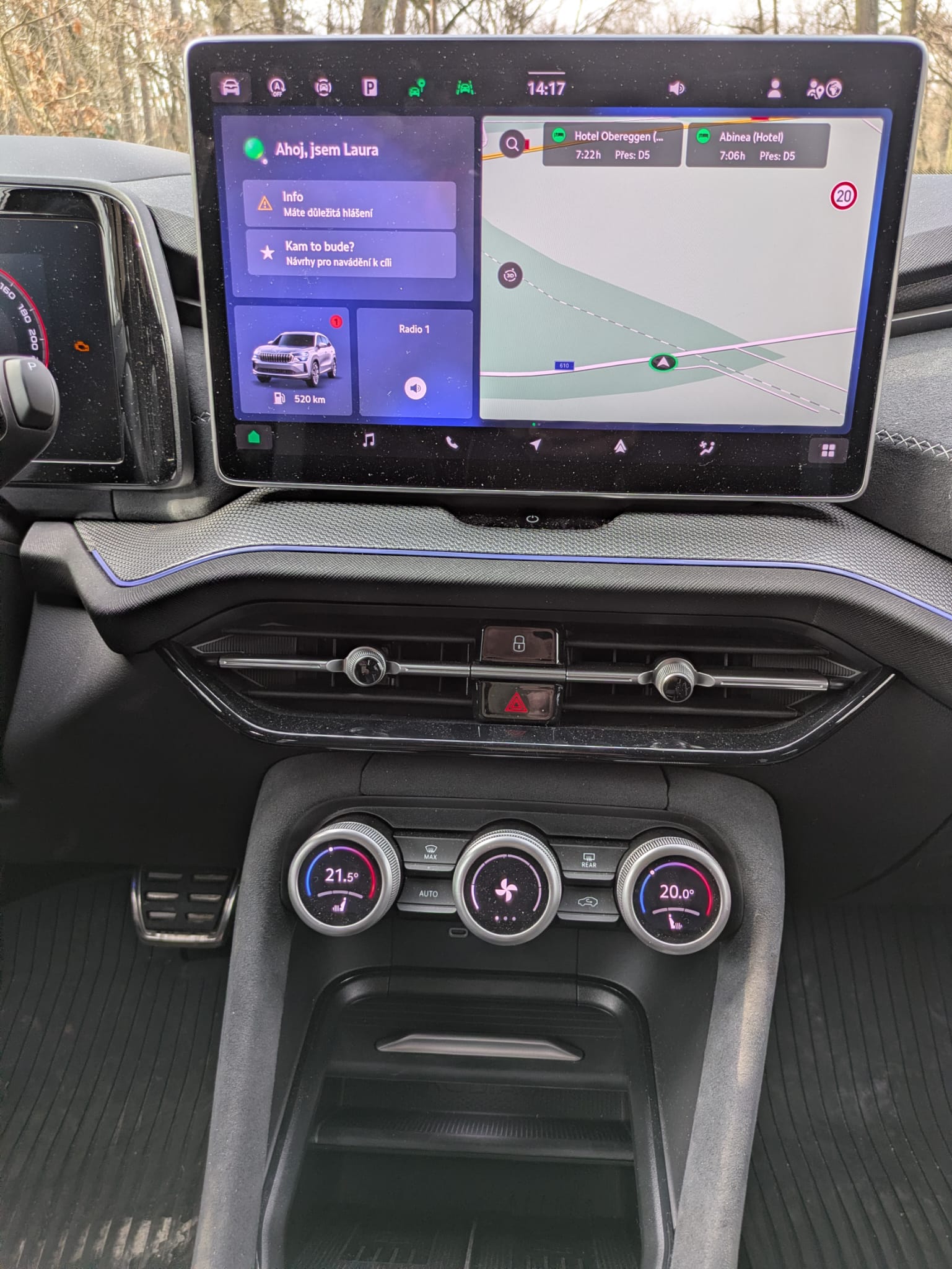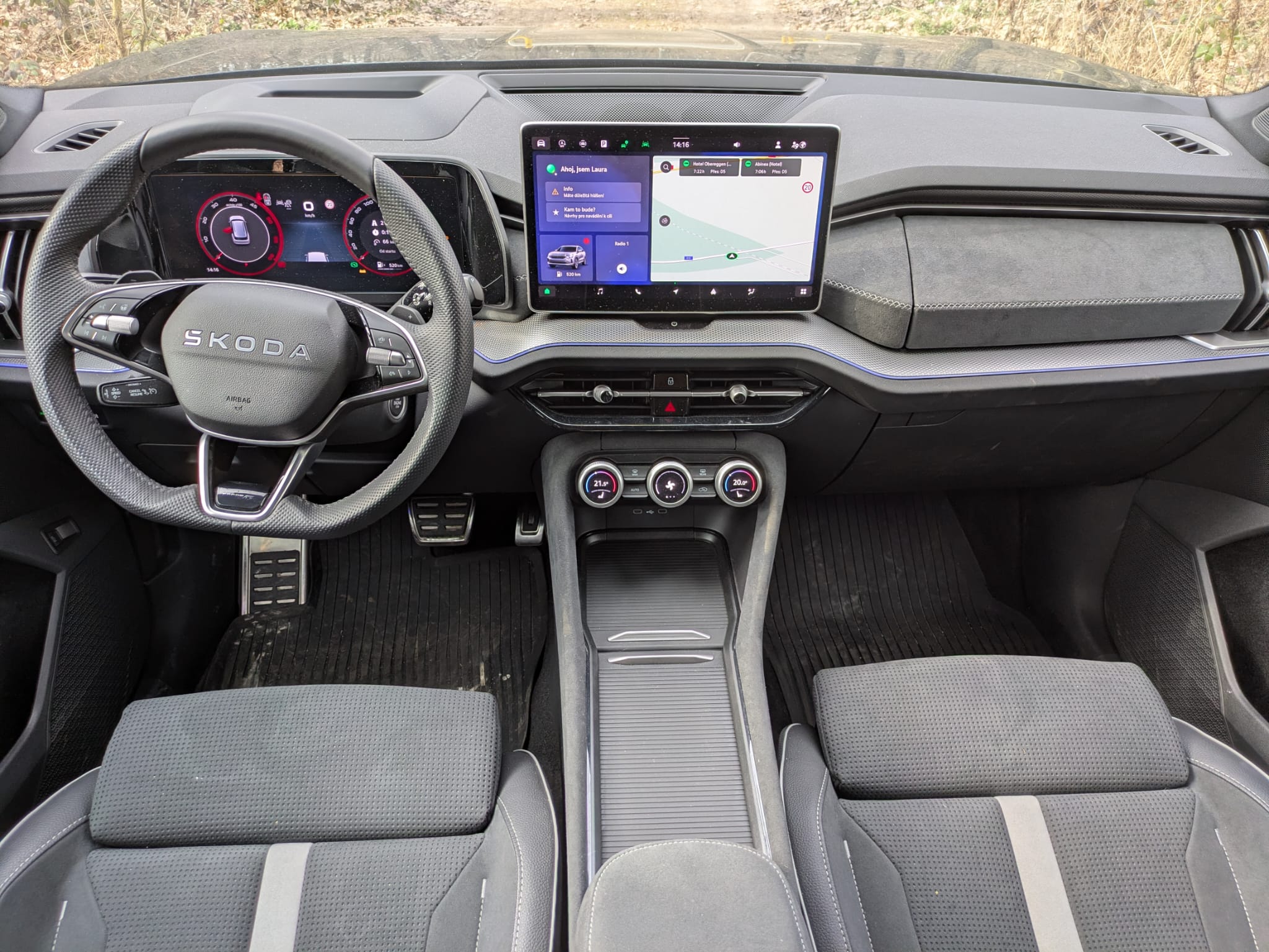 A šupky za volant. Řidič má elektricky nastavitelné sedadlo s pamětí pro lepší nastupování. Řízení zpříjemní vnitřní zpětné zrcátko s automatickým stmíváním, vyhřívané čelní sklo, volant i přední sedačky. Jen pozor na panoramatickou zpětnou kameru v zrcátku… Pro komfort nepotřebujete hned kůži, ale černý samet postačí. Uvnitř dodává eleganci ambientní osvětlení výplně dveří a palubní desky. Třízónová klimatizace Climatronic vylepší prostředí, ale využívám jen topení, ne chlazení… Tři otáčecí knoflíky smartdials pod displejem postačí, v jednoduchosti je síla. Snad jen nadělených přihrádek ve středové konzoli snad až tolik netřeba. Taky omezení bezklíčového vstupu na přední dveře mi nevyhovovalo.